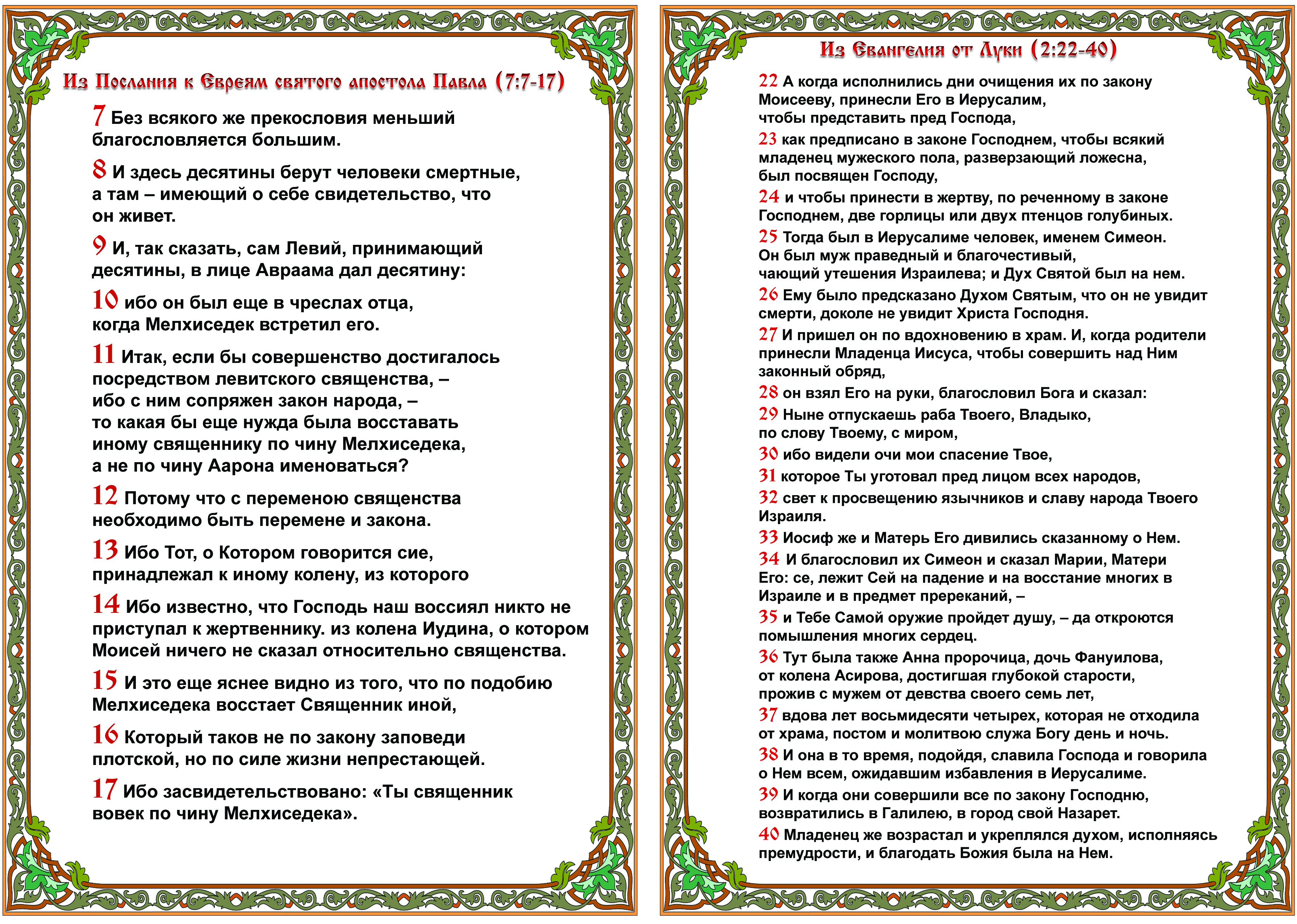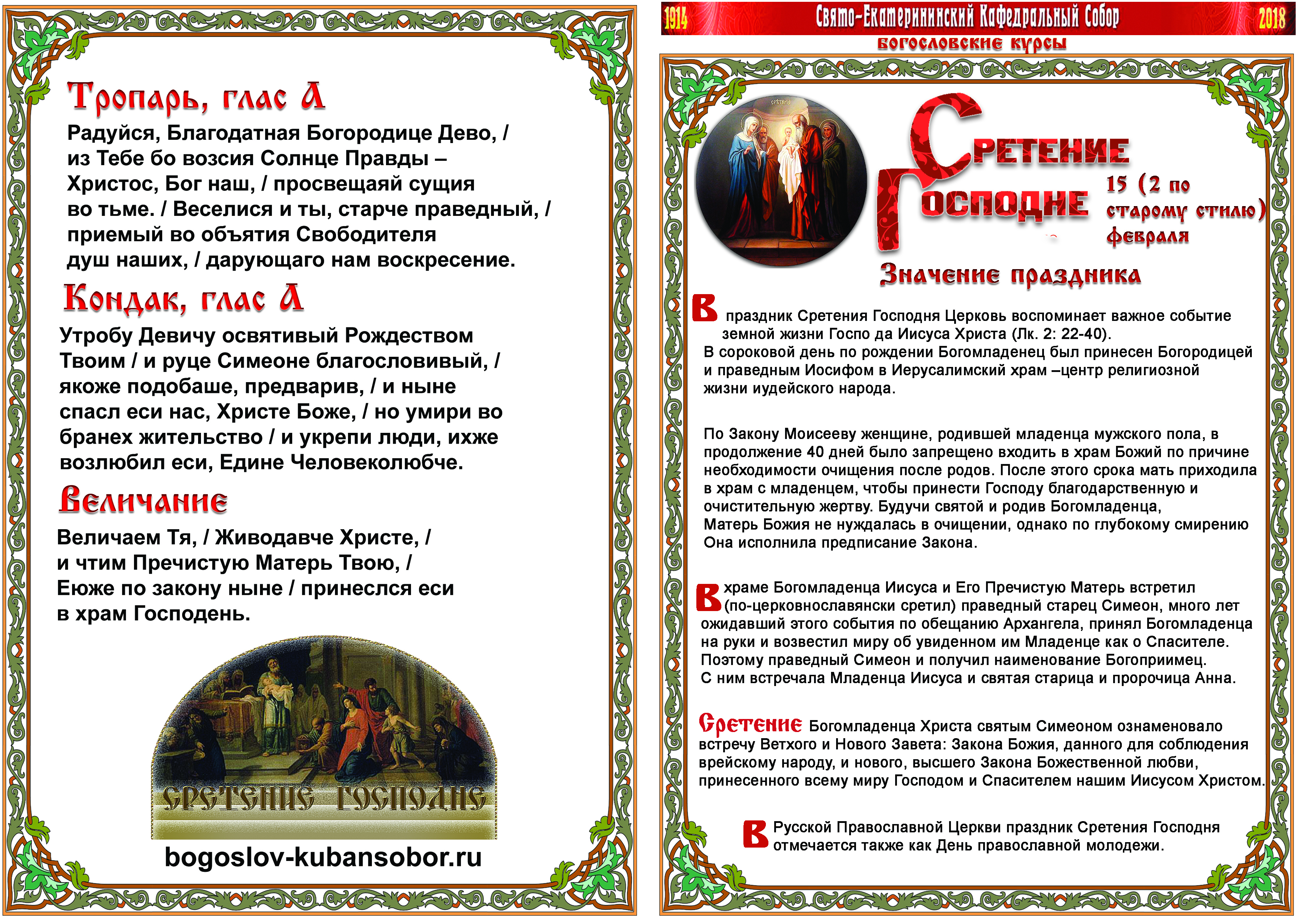 Церковь в этот праздник прославляет Богомладенца Иисуса и Его Пречистую Матерь Деву, принесшую в храм сорокадневного Первенца Сына для посвящения Богу Отцу.
