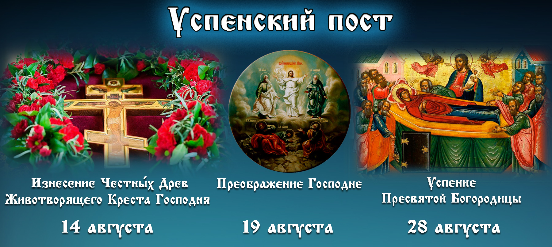 На первый день Успенского поста приходится праздник «Изнесение Честных Древ Животворящего Креста Господня». Также на время поста приходится двунадесятый праздник – Преображение Господне (19 августа).