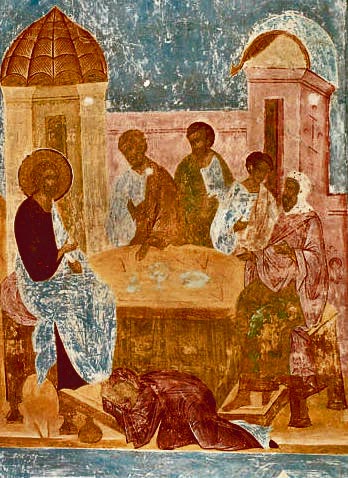 Мне же кажется более верным мнение Златоуста, что здесь различаются две женщины: одна, как сказано, (упоминаемая) у трех евангелистов, — блудница и грешница, возлившая миро на голову Христу; а другая, у Иоанна, — Мария, сестра Лазаря, принесшая его к одним Божественным ногам Христа и помазавшая их. И (думаю), были разные вечери: иные — в Вифании, и иная — Тайная. Это следует также из того, что после истории с блудницей Спаситель послал учеников в город приготовить пасху, повелев: пойдите в город к такому-то и скажите ему: Учитель говорит: у тебя совершу пасху с учениками Моими (Мф. 26, 18). И еще: и встретится вам человек, несущий кувшин воды. И он покажет вам горницу большую устланную: там приготовьте нам. Они пошли и нашли, как сказал им, и приготовили пасху (ср.: Мк. 14: 13, 15, 16; Лк. 22: 10, 12, 13), очевидно, приближающуюся законную, которую (Господь), придя, и совершил с учениками, как говорит святой Златоуст, а потом была вечеря, то есть Тайная. Совершив посреди нее божественное умовение (ног), Он, возлегши опять (см.: Ин. 13, 2—12), преподал и нашу Пасху — на одной трапезе (с ветхозаветной), как говорит Иоанн Златоуст, и это действительно так.